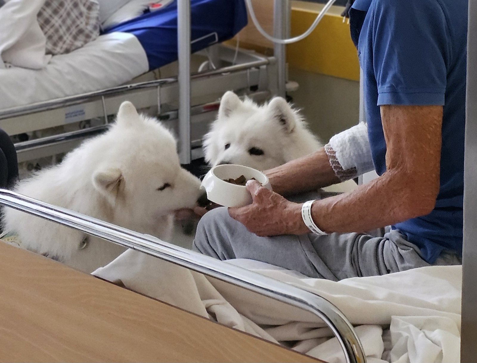 Paliatīvās aprūpes nodaļas palātā trenera pavadībā pie pacientiem tiek pievestas apmācītās samojedu šķirnes suņudāmas Mona un Stella. Cilvēki suņiem pieskaras, noglauda galvu, samīļo un aprunājas.