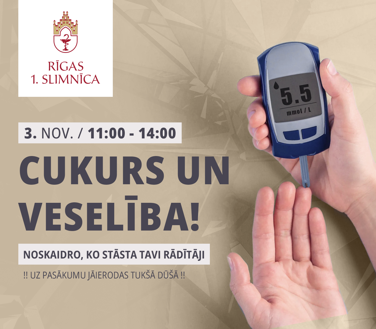 Atzīmējot Pasaules diabēta dienu (14. novembrī), 3. novembrī Rīgas 1. slimnīcā notiks bezmaksas cukura diabēta pārbaudes diena. Ar šo pasākumu slimnīca vēlas pievērst sabiedrības uzmanību cukura diabētam, tā profilaksei un savlaicīgai diagnostikai, kā arī atgādināt, cik svarīgi ir vismaz reizi gadā veikt veselības pārbaudes un apmeklēt ārstu.