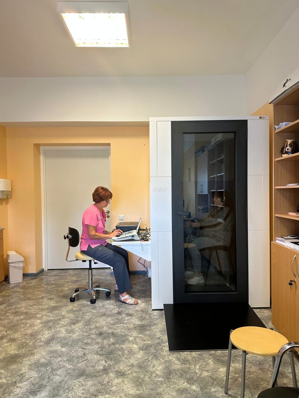 Jauniegādātā audiometrijas kabīne integrēta LOR darba stacijā tā, lai veiktu pacientu apskati un dzirdes pārbaudi vienuviet. “Līdz šim audiometriju pacientiem iespējams bija veikt, konsultācijas laikā mainot kabinetu un pat stāvu, kas prasīja daudz vairāk laika, kā arī nebija pietiekami ērti pacientam. Šobrīd, pēc apskates, ja nepieciešams veikt dzirdes pārbaudi, to iespējams veikt turpat, jaunajā audiometrijas kabīnē — viss vienuviet, ērtāk gan pacientam, gan personālam,” piebilst Dr. Eimane-Habarova. Jauna audiometrijas kabīne ir iegādāta arī Talsu filiālei.