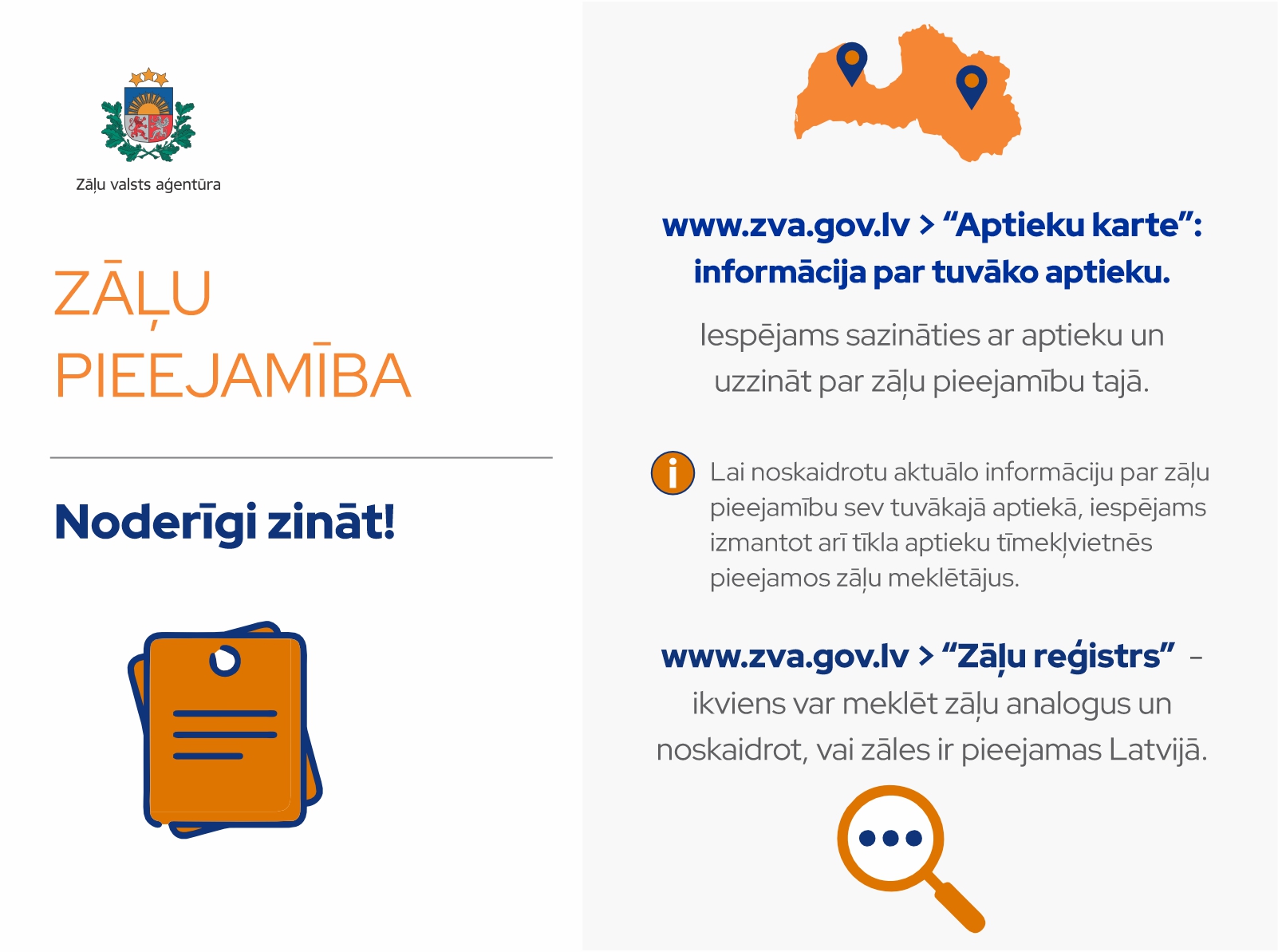 Zāļu Valsts aģentūra informē, ka saskaņā ar ražotāju pārstāvju jeb zāļu reģistrācijas apliecības īpašnieku sniegtiem paziņojumiem, ZVA informāciju par zāļu pieejamību publicē Latvijas zāļu reģistrā ZVA tīmekļvietnē www.zva.gov.lv. Zāļu reģistrā tiek publicēta informācija par zāļu pieejamību lieltirgotavās. Savukārt, lai noskaidrotu informāciju par zāļu faktisko pieejamību aptiekās, iespējams izmantot arī tā dēvēto aptieku tīklu tīmekļvietnēs pieejamos zāļu meklētājus.