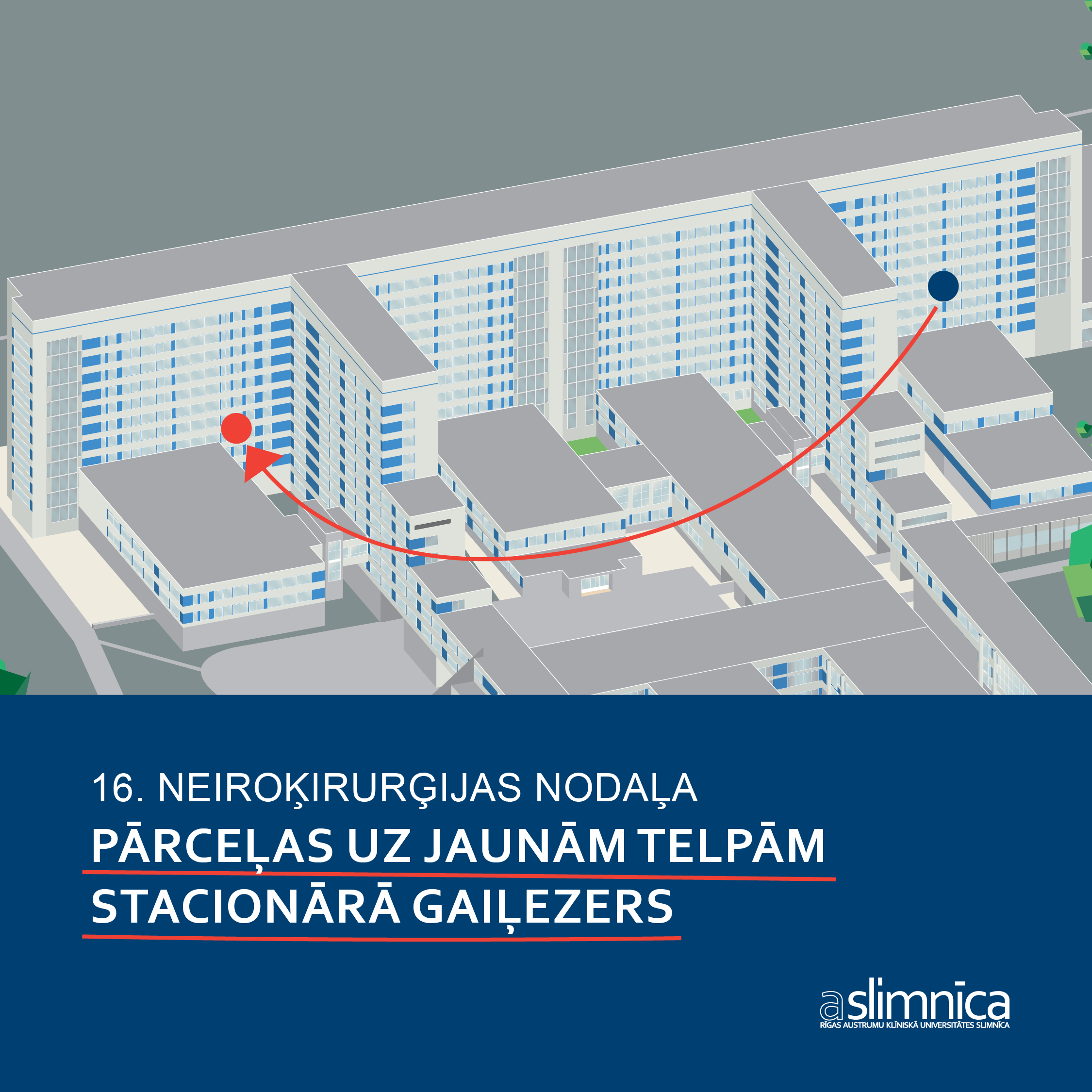 Nedēļas ietvaros no 2026. gada 19. līdz 25. janvārim plānota 16. Neiroķirurģijas nodaļas pārcelšanās no stacionāra “Gaiļezers” 1. korpusa 5. stāva uz stacionāra “Gaiļezers” 9. korpusa 3. stāvu – pacientu pārvietošana notiek šodien, 21. janvārī, un nodaļa tuvinieku apmeklējumiem un sūtījumu nodošanai jaunajās telpās būs pieejama 21. janvārī pēc plkst.17:00!