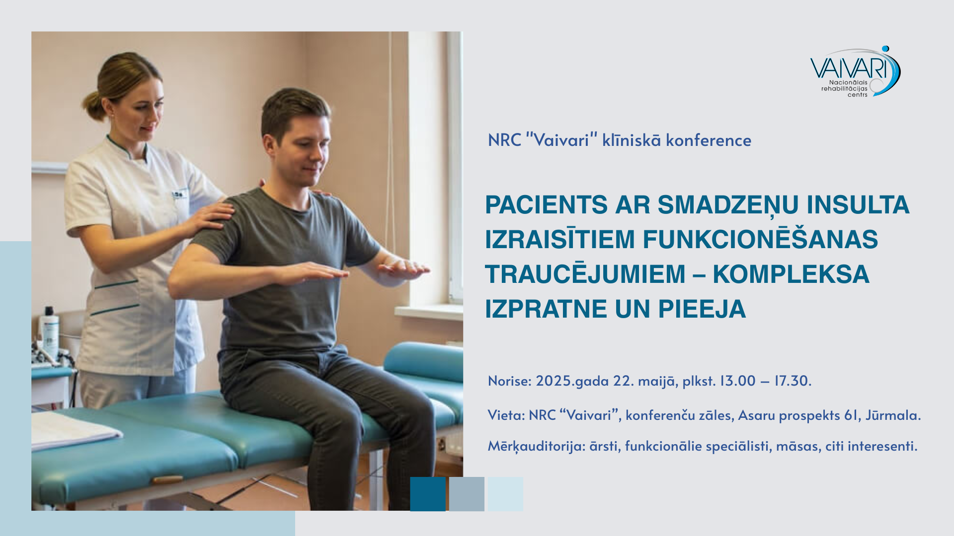 Nacionālais rehabilitācijas centrs “Vaivari” šogad atzīmē 33 pastāvēšanas gadus, un svētkus svinēs ar klīnisko konferenci “Pacients ar smadzeņu insulta izraisītiem funkcionēšanas traucējumiem – kompleksa izpratne un pieeja”, kas norisināsies 22.maijā, NRC “Vaivari” telpās. Konference apvienos dažādu veselības aprūpes jomu profesionāļus, lai diskutētu par vienu no aktuālākajiem mūsdienu rehabilitācijas izaicinājumiem – insulta pacientu visaptverošu atbalstu gan akūtā, gan ilgtermiņa atveseļošanās procesā.